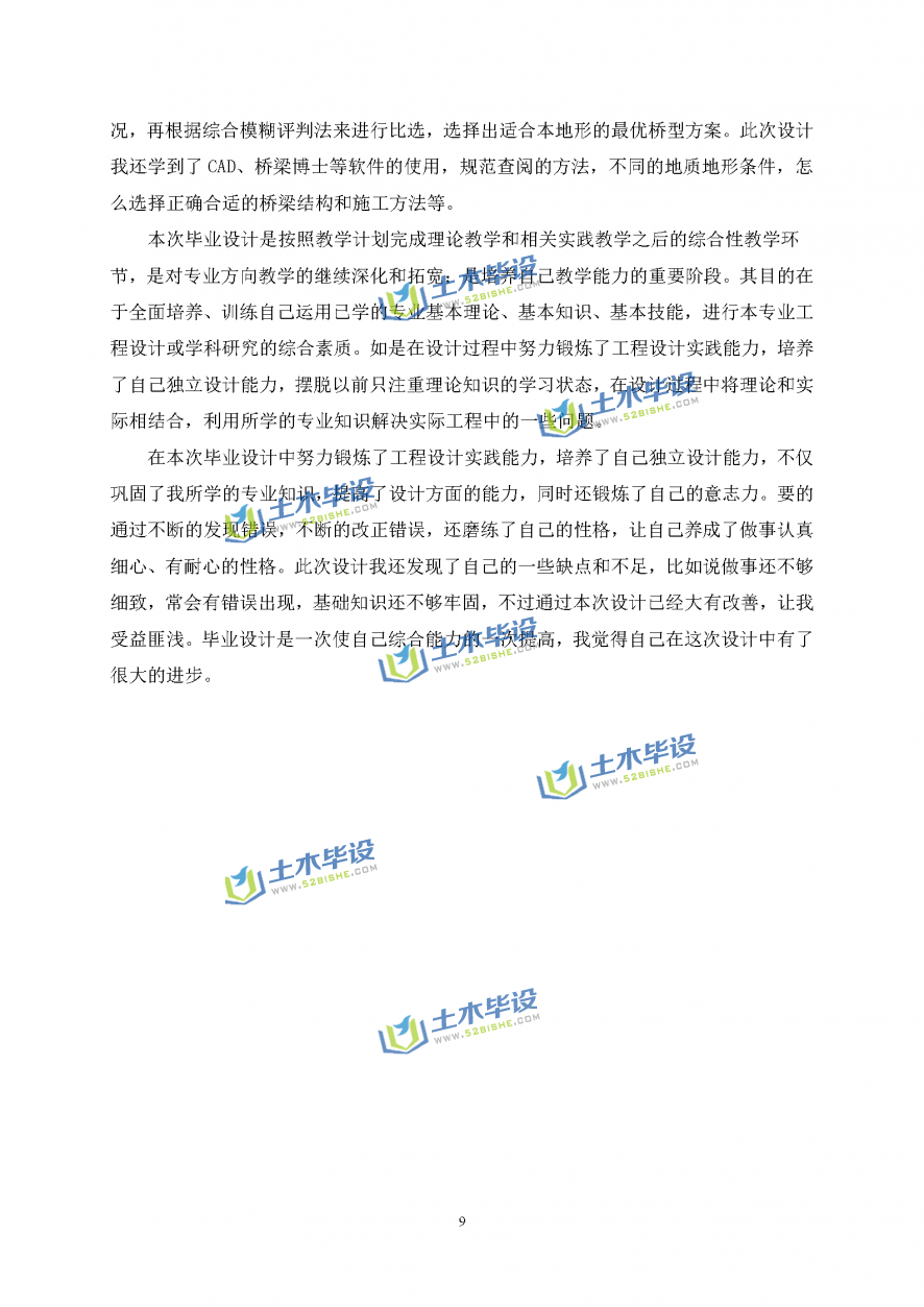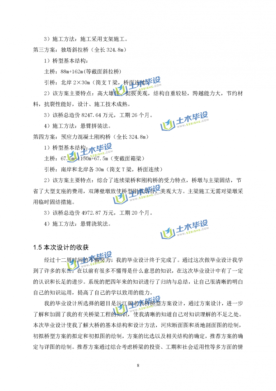 本设计是根据设计任务书的要求和《公路桥规》的规定对沅江阁老大桥进行方案比选和设计。对该桥的设计,本着“安全、实用、经济、美观”的八字原则,本设计提出三种不同的桥型方案进行比较和选择。方案一为预应力混凝土连续梁桥,方案二为预应力连续刚构桥,方案三为独塔斜拉桥。经由以上原则以及设计施工等诸多方面考虑后,确定预应力混凝土连续梁桥为最终设计方案。本预应力混凝土连续梁桥共分为三跨(70m+110m+70m)主跨110m,边跨对称70m;主梁采用单箱双室预应力混凝土箱梁,跨中梁高为2.6m,支座处梁高为6.5m,截面高度按二次抛物线形式变化;桥面净宽为24m;设计荷载为公路-Ⅰ级。在设计中,运用了桥梁设计软件桥梁博士建立引桥模型,并对桥梁恒载、活载及徐变内力进行分析计算,得出预应力钢束的预估值。最后对引桥的应力、变形等进行验算。经分析比较及验算表明该设计计算方法正确,内力分布合理,符合设计任务的要求,无图纸