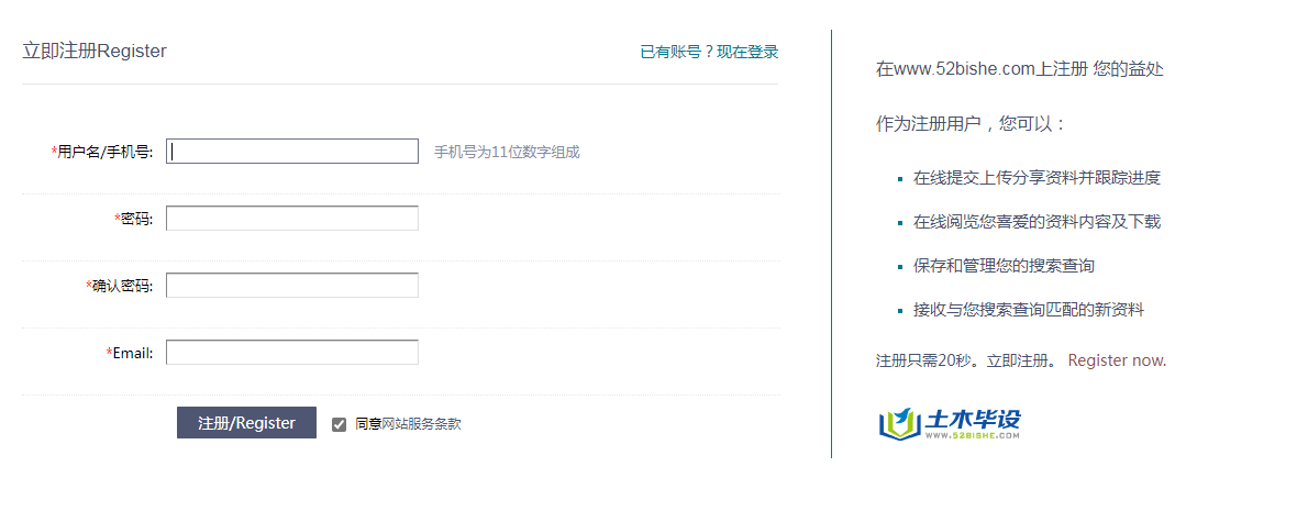 注册网站账号 进入网站账号注册页面:http://www.52bishe.com/member.php?mod=register 填写 用户名、密码、邮箱,填写完毕后,输入 验证码,点击 提交 ,成功注册网站账号
