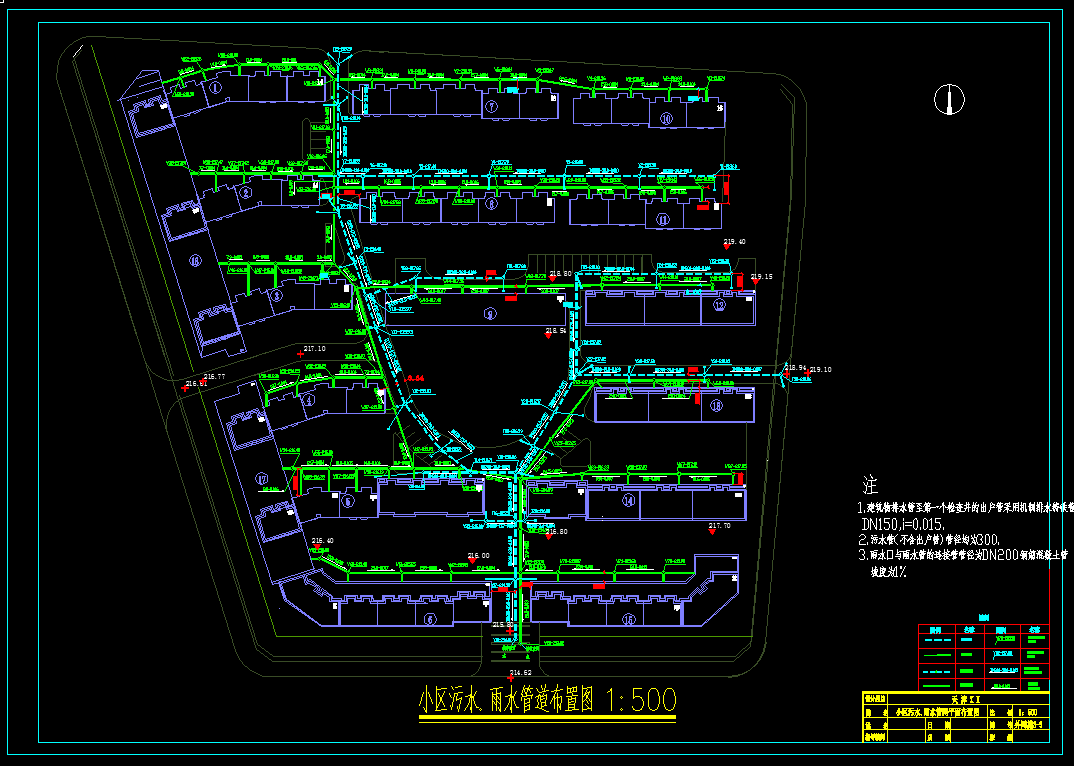 供暖系统:小区高低区分别采暖,小区的热源由换热站供给,本工程采暖热力管道采用无补偿方式直埋敷设。给水系统:本小区给水水源,消防水源均来自给水泵房,室外消防管网与低区生活管网合用管道,并形成环状供水。低层建筑的消防给水也布置成环路,并且为了供水安全使用两根入户管,高层建筑采用两根供水管同时供水的方式保证供水安全。排水系统:本小区污水与雨水采用分流制,分别排入市政的管网,污污水管和雨水管的管材均采用承插式钢筋混凝土管. 钢筋混凝土管采用橡胶圈接口。系统型式用支状管网。敷设方式管线采用无沟(直埋)敷设方式。目前最多采用的型式是供热管道、保温层和保护外壳。三者紧密粘接在一起,形成整体式的预制保温管结构型式。管道附件在与干管相连接的管路分支处与分支管路相连接的较长的用户支管处均应装设阀门;在最低点或局部最低点应设泄水阀,最高点或局部最高点设放空气阀。考虑补偿器与固定支架的配合设置,在需要的位置设检查井。